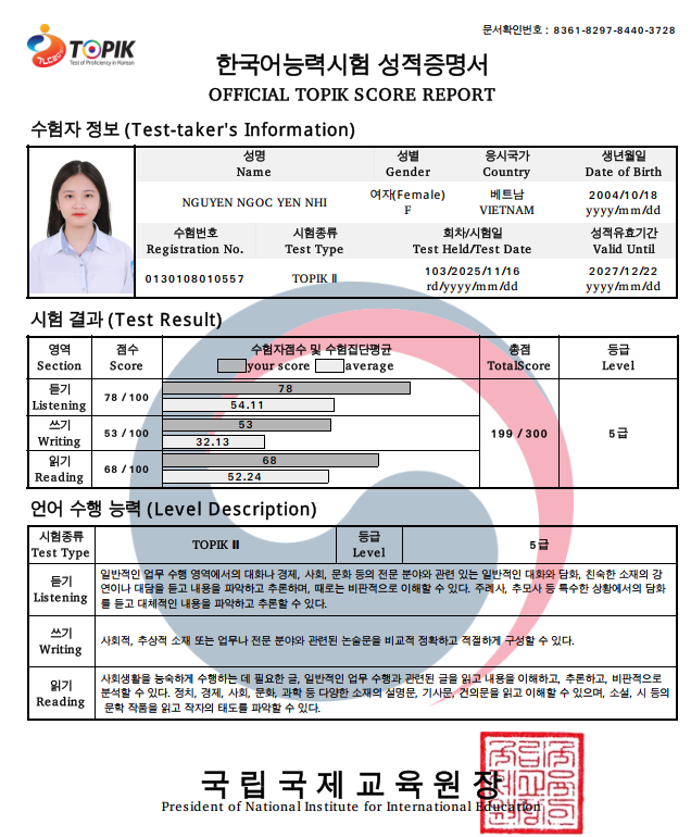 Tôi có bằng IELTS 7.0 (chứng chỉ ngoại ngữ tiếng Anh) và TOPIK 5 (chứng chỉ ngoại ngữ tiếng Hàn). Tôi muốn tập trung vào giảng dạy tiếng Hàn.